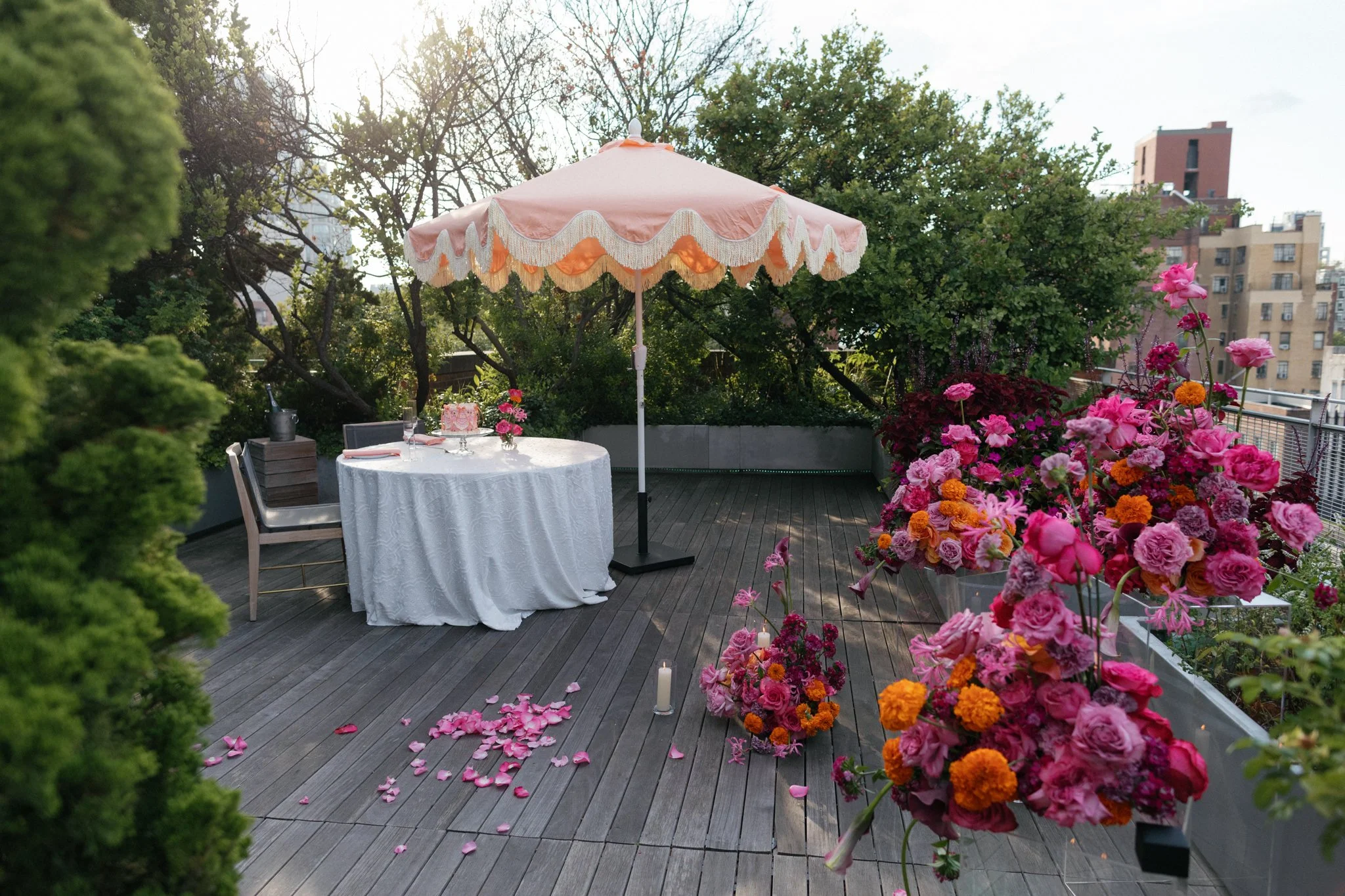 A fringed umbrella stood nearby, instantly evocative of Palm Springs—one of Stella and Ariana’s favorite destinations. It served as both visual anchor and emotional reference point, transporting them to a place that symbolized freedom, warmth, and shared memory. These layered design elements are at the heart of what defines a truly custom NYC proposal: not decoration, but storytelling.